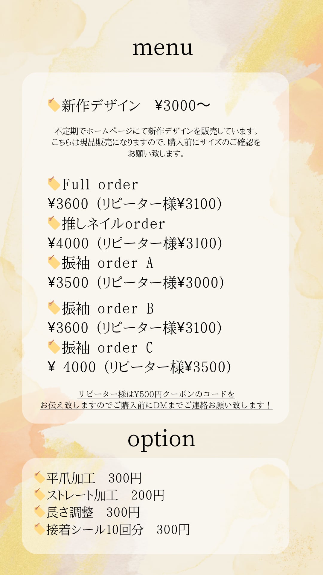 | 1.こちらのページをご購入後、お問い合わせ、InstagramのDM(ID:kohaku.nail_tip)のどちらかで、お名前、オーダー希望とお伝え下さい。