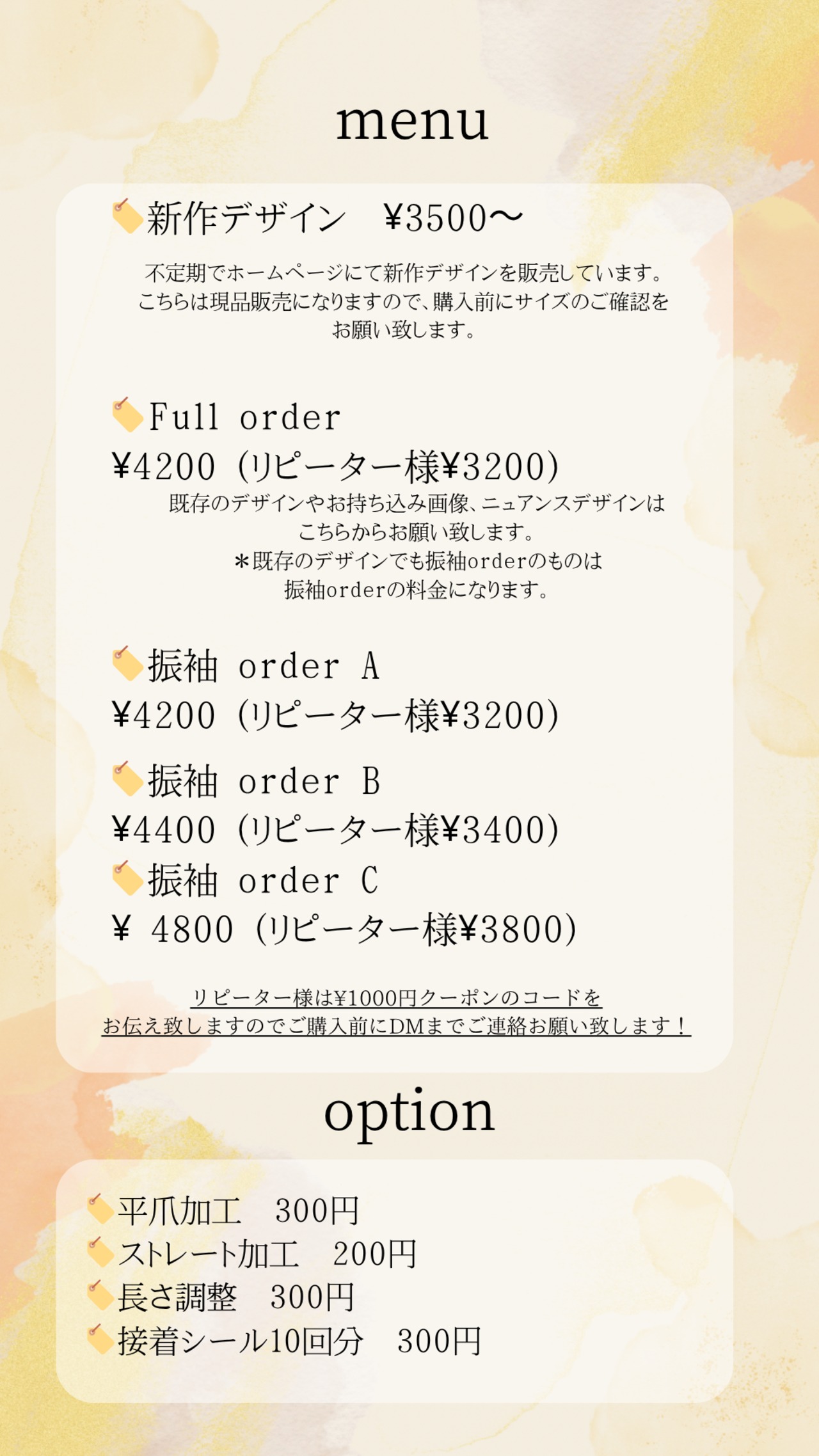 | 1.こちらのページをご購入後、お問い合わせ、InstagramのDM(ID:kohaku.nail_tip)のどちらかで、お名前、オーダー希望とお伝え下さい。